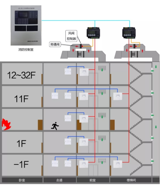 2、關于樓梯間,因為余壓監(jiān)控區(qū)域為一個空間且上下貫穿,余壓傳感器僅在整個修建樓梯間高度的1/3處安裝一個,余壓傳感器的勘探點一側設于樓梯間,另一側設于走道,余壓設定值為40-50pa,當系統(tǒng)操控區(qū)域超壓時,系統(tǒng)聯(lián)動操控泄壓閥執(zhí)行器,依據(jù)實踐余壓值與設定值的差異調(diào)理泄壓閥,以確保前室正壓為設定值。