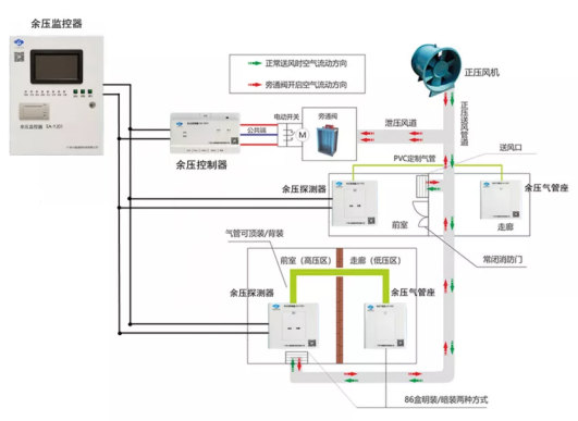 鑒于上述考慮,公安部消防科學(xué)研究所結(jié)合國(guó)際經(jīng)驗(yàn)提出余壓值的數(shù)據(jù)。壓差操控系統(tǒng)可通過(guò)操控旁通閥的開(kāi)閉,將機(jī)械加壓送風(fēng)系統(tǒng)的余壓值有用操控在國(guó)標(biāo)要求的合理范圍內(nèi)-----防煙樓梯間40-50Pa,前室、合用前室、消防電梯間前室、封閉避難層(間)為25-30Pa。這樣既阻撓了有害煙氣的進(jìn)入,也確保了防火門(mén)在需求人員分散時(shí)能夠正常開(kāi)閉。