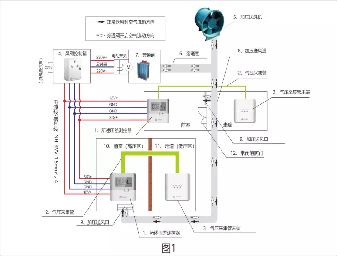 余壓監控系統的整個意圖就是保持樓梯間和前室的余壓值維持在國家標準范圍,阻撓有害煙氣進入的一起,保證防火門的正常敞開,保證生命通道的疏通。