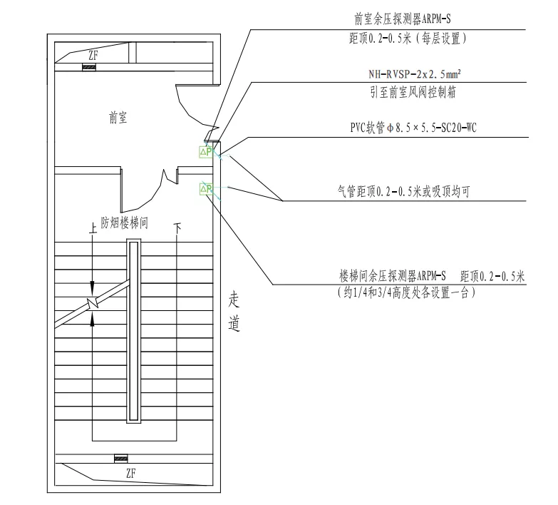 4.余壓深測器通過N-IYSP-2x2.5m2-SC20-C,沿樓板垂直敷設至風間控制箱。