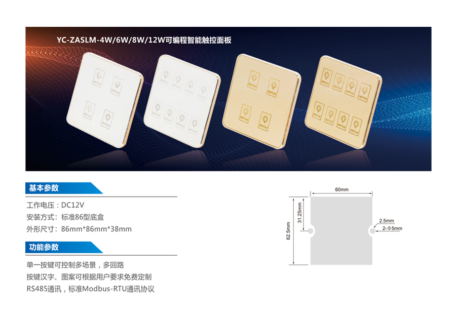 單一按鍵可控制多場景,多回路;按鍵漢字、圖案可根據(jù)用戶要求免費定制;RS485通訊、標準Modbus-RTU通訊協(xié)議